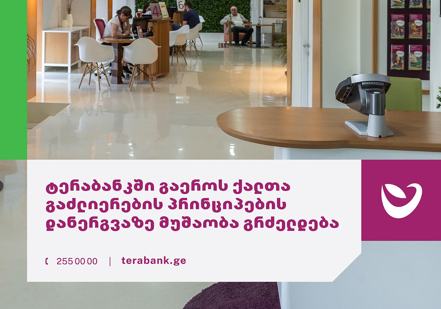 ტერაბანკი, როგორც გაეროს ქალთა გაძლიერების პრინციპებზე (WEPs) ხელმომწერი კომპანია, ბანკის შიგნით ამ პრინციპების განხორციელებისა და შესაბამისი ორგანიზაციული სისტემის დანერგვისთვის აქტიურ ნაბიჯებს დგამს.