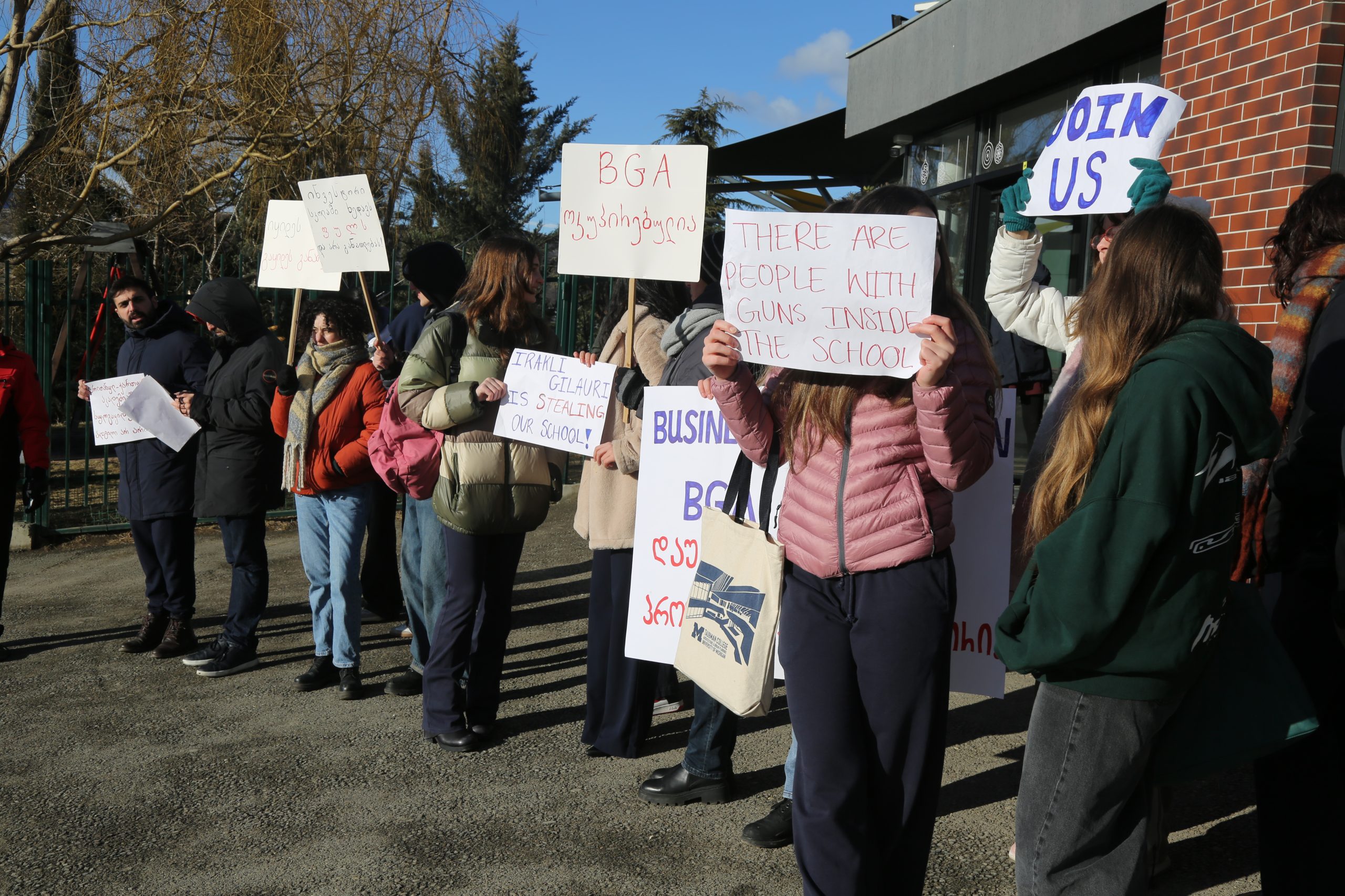 ბრიტანულ–ქართული აკადემიის კურსდამთავრებულებმა დღეს დილით, 8:00 საათზე, სკოლის შესასვლელთან საპროტესტო აქცია გამართეს. ისინი ინვესტორი კომპანიის მიერ სკოლის მენეჯმენტში უხეშ ჩარევას აპროტესტებდნენ და მოითხოვდნენ დირექტორის თანამდებობაზე აკადემიის დამფუძნებელი პარტნიორის ნათია ჯანაშიას დაბრუნებას. “ინვესტორი ხედავს ფულს და არა განათლებას”, “BGA ოკუპირებულია”, “იყიდეს სკოლა, გაყიდეს განათლება”, “ბრიტანულ-ქართულ აკადემიაში სულგაყიდულების ადგილი არ არის” – ამ შინაარსის ტრანსფარანტებით აღჭურვილი დემონსტრანტები სკანდირებდნენ: “კეთილაძე, გამოდი!“.