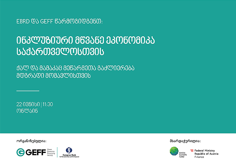 22 ივნისს, 11:30 საათზე, ევროპის რეკონსტრუქციისა და განვითარების ბანკის (EBRD) და მისი მწვანე ეკონომიკის დაფინანსების პროგრამის (GEFF) ორგანიზებით ონლაინ ღონისძიება – “ინკლუზიური მწვანე ეკონომიკა საქართველოსთვის” გაიმართება. შეხვედრა მიზნად ისახავს კლიმატის ცვლილებასთან დაკავშირებული გამოწვევების ანალიზსა და იმის განხილვას, თუ რა გავლენა აქვთ მათ ქალ და მამაკაც მეწარმეთა საქმიანობაზე, ასევე, როგორ უმკლავდება ამ გამოწვევას მიკრო, მცირე და საშუალო ბიზნესი.