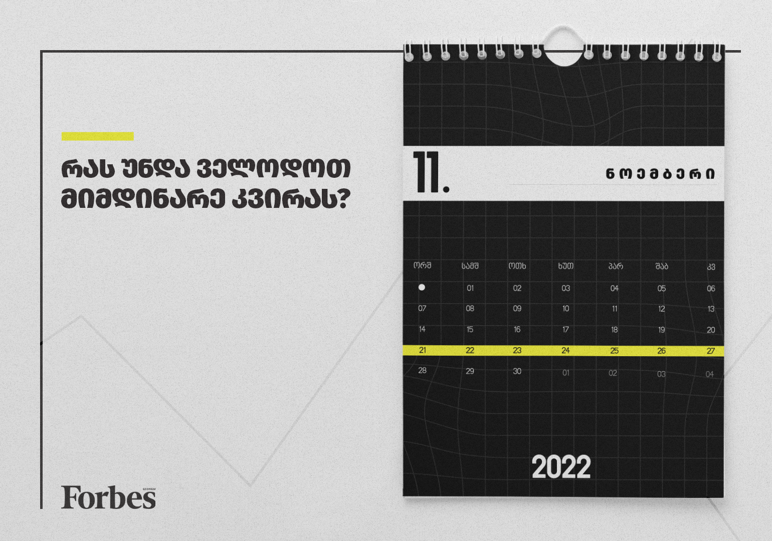 რაც შეეხება საქართველოს, საქსტატი მიმდინარე კვირის დასაწყისში 2022 წლის ოქტომბრის საგარეო ვაჭრობის და ადგილობრივი ექსპორტის მაჩვენებლებს გამოაქვეყნებს. გარდა ამისა, იგეგმება ოქტომბრის სამრეწველო პროდუქციის მწარმოებელთა ფასების ინდექსის, მწარმოებელთა ფასების ინდექსის სატრანსპორტო და სასაწყობო მომსახურებაზე, მშენებლობისთვის შეძენილი მასალების ფასების ინდექსის, ექსპორტისა და იმპორტის ფასების ინდექსის, ადგილობრივი ბაზრისთვის წარმოებული სამრეწველო პროდუქციის მწარმოებელთა ფასების ინდექსის, სატელეკომუნიკაციო მომსახურების მწარმოებელთა ფასების ინდექსის, ადგილობრივ ბაზარზე მიწოდების მწარმოებელთა ფასების ინდექსისა და დროებითი განთავსების საშუალებებით და საკვებით უზრუნველყოფის მომსახურებაზე მწარმოებელთა ფასების ინდექსის გამოქვეყნება. 24 ნოემბერს მიმდინარე წლის მესამე კვარტალის გამყვანი ტურიზმის სტატისტიკა გახდება ცნობილი, ხოლო კვირის ბოლოს რამდენიმე სტატისტიკური პუბლიკაცია გასაჯაროვდება, მათ შორის „საქართველოს ბუნებრივი რესურსები და გარემოს დაცვა, 2021“ და „ბიზნესსექტორი საქართველოში 2021“.