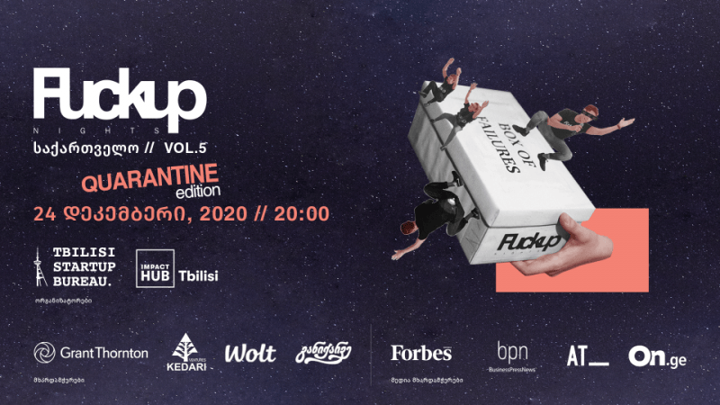 Fuckup Nights საქართველო კარანტინში vol. 5, 24 დეკემბერს, თბილისის დროით 20:00-საათზე სეზონის ბოლო, კიდევ ერთ საინტერესო საღამოს გვპირდება წარუმატებელი 2020 წლის გასაცილებლად, იმით, რაც მათ ყველაზე კარგად გამოსდით – მარცხის ისტორიების გაზიარებითა და გართობით. Tbilisi Startup Bureau-სა და Impact Hub Tbilisi-ის მასპინძლობით ღონისძიება უკვე ოცდამეშვიდედ ჩატარდება, მიმდინარე მოვლენების გათვალისწინებით, რაღა თქმა უნდა, ისევ და ისევ ონლაინ რეჟიმში.
