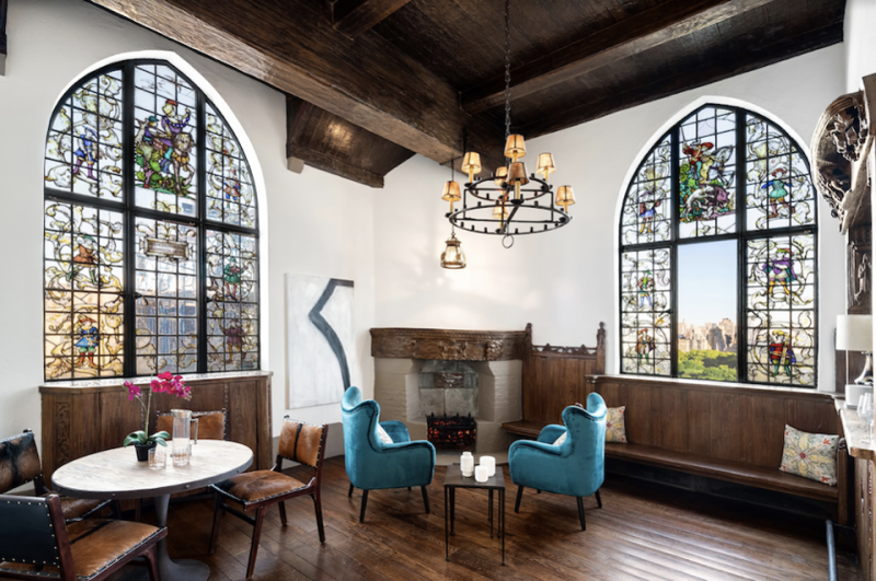 During Legere’s tenure there he oversaw an extensive renovation in conjunction with architectural design firm SheltonMindel to upgrade the interiors while still retaining it 1920s feel. The above living room has the original leaded and stained glass arched windows, wood beams and carved fireplace mantle that graced the home when it was built.