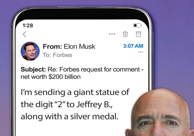 თუმცა,  ეს არ არის ამ ისტორიის ყველაზე საინტერესო დეტალი: საქმე იმაშია, რომ მას მერე, რაც Forbes-ი ილონ მასკს კომენტარისთვის ელექტრონული ფოსტის საშუალებით დაუკავშირდა, მასკმა მათ ასეთი პასუხი მისწერა: „ჯეფრი ბ.-ის ორიანის ფორმის გიგანტურ ქანდაკებას და ვერცხლის მედალს გავუგზავნი“.