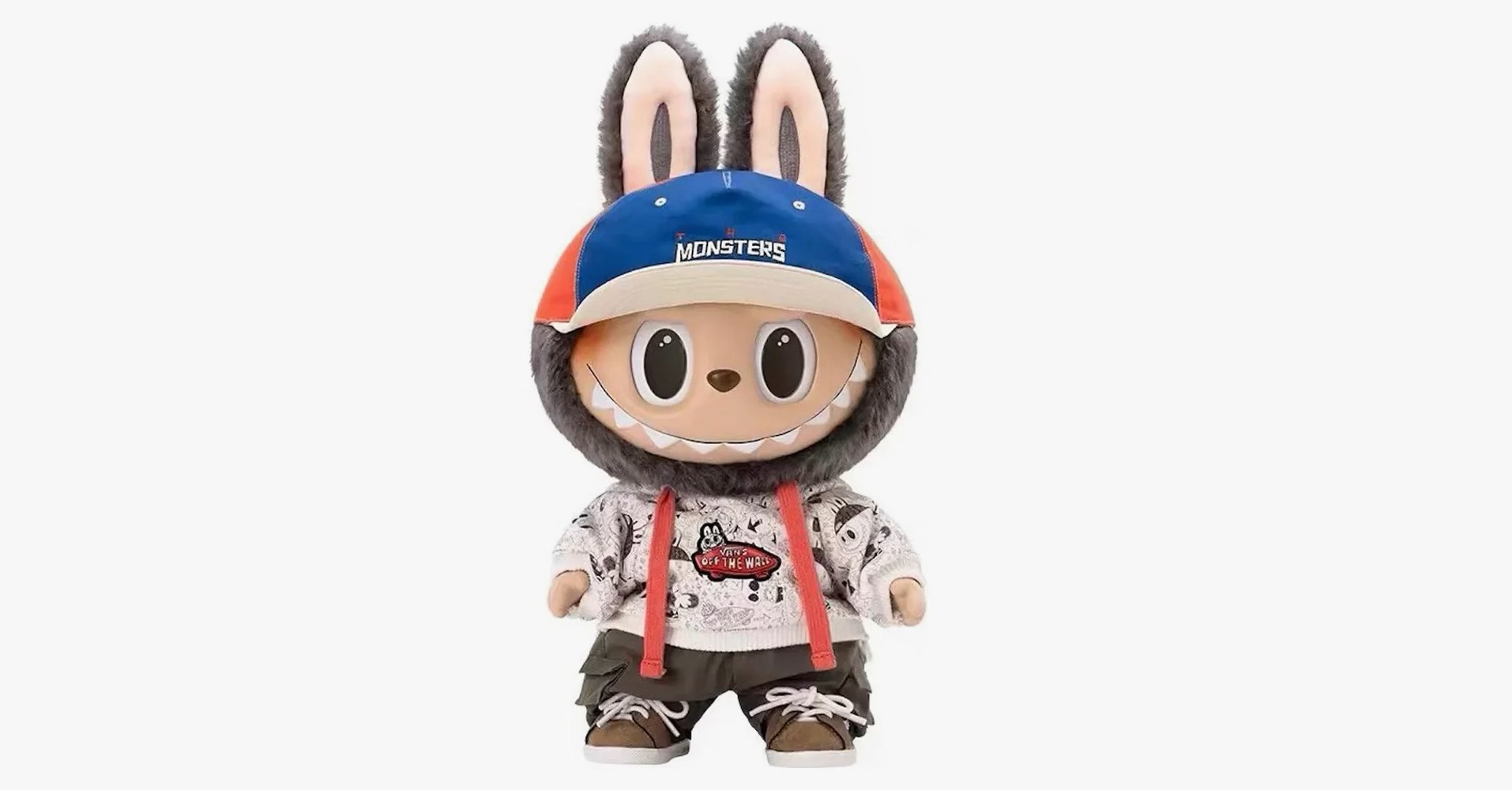 ყავისფერ თოჯინას Vans-ის ქუჩის სტილის სამოსი აცვია — მათ შორის Sk8-Mid-ის სპორტული ფეხსაცმელი, ასევე Vans-ის სვიტერი და ლურჯ-ნარინჯისფერი ქუდი წარწერით „The Monster“, პერსონაჟების სერიის სახელი, რომელსაც Labubu ეკუთვნის.