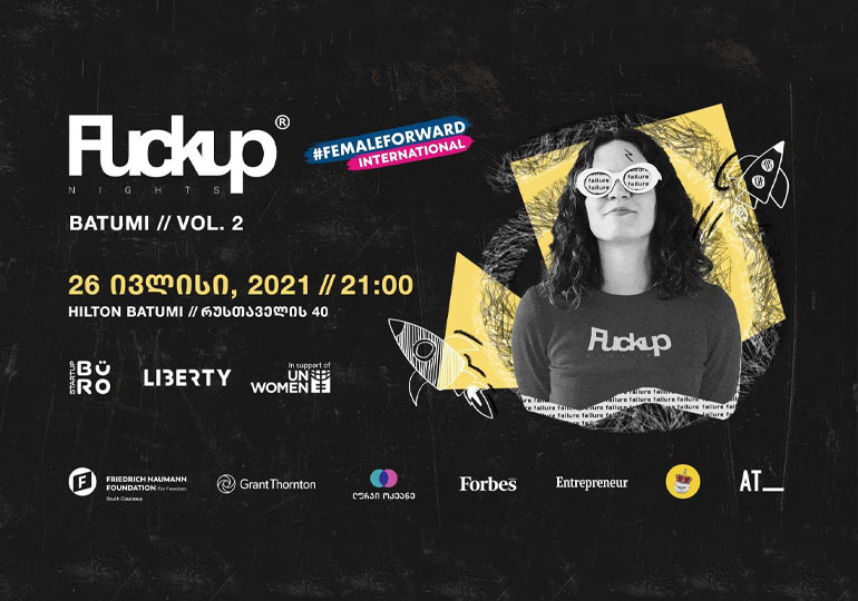 ბათუმი, სასტუმრო „ჰილტონი“(რუსთაველის N40), 21:00 საათი – როგორია მარცხი, რომელიც წარმატებისკენ ნაბიჯის გადადგმასა და მნიშვნელოვან მოტივაციას ნიშნავს — მეწარმე ქალები აუდიტორიას საკუთარ გამოცდილებას ბათუმში, Fuckup Nights-ზე გაუზიარებენ.