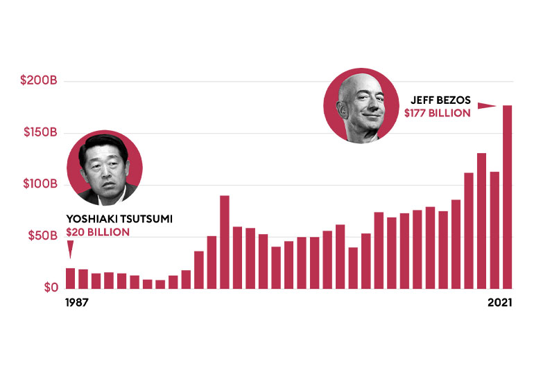 უკვე მეოთხედ სიის სათავეში მსოფლიოს უმდიდრესი ადამიანი, ჯეფ ბეზოსია – მისი ქონება $177 მილიარდად არის შეფასებული. გასულ წელს მისი ქონება $64 მილიარდი იყო, Amazon-ის აქციების ფასების ზრდამ მისი ქონება მნიშვნელოვნად გაზარდა. მეორე პოზიციას სიაში ილონ მასკი იკავებს – $151 მილიარდიანი ქონებით. შარშან მასკი სიაში 31-ე იყო, $24.6 მილიარდით, თუმცა Tesla-ს აქციებზე ფასის მკვეთრმა ზრდამ მისი ქონების ღირებულება $126.4 მილიარდით გაზარდა. სიაში მესამე ადგილს ბერნარ არნო იკავებს, ფრანგული LVMH-ის მფლობელის ქონება წინა წელთან შედარებით თითქმის გაორმაგდა და ამჯერად $150 მილიარდს შეადგენს. მსოფლიოს 10 ყველაზე მდიდარი ადამიანის ქონება ჯამში $1.15 ტრილიონია – აღნიშნული მაჩვენებელი წინა წლის იდენტურ მაჩვენებელზე 2/3-ით მეტია.