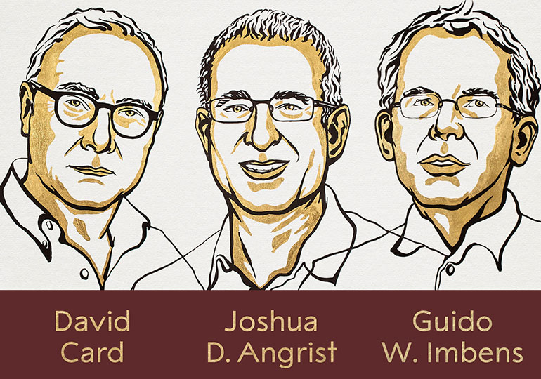 ეკონომიკის დარგში ნობელის პრემია ეკონომისტებმა დევიდ კარდმა, ჯოშუა ანგრისტმა და გვიდო იმბენსმა მიიღეს. მათ ეკონომიკური პოლიტიკისა და სხვა მოვლენების მიზეზშედეგობრივი კავშირის დასადგენად „ბუნებრივი ექსპერიმენტები“ გამოიყენეს.