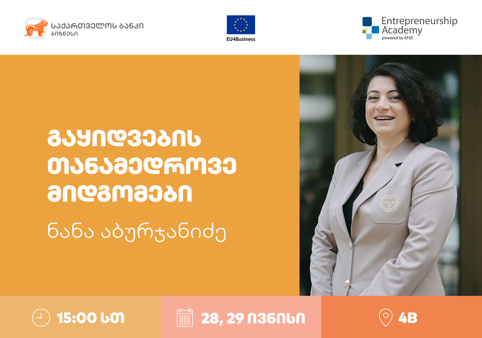 საქართველოს ბანკი ბიზნესის ხელშეწყობას განაგრძობს, განსაკუთრებით კი ქალი მეწარმეების მხარდაჭერას. ამ მიზნით 28-29 ბანკისა და EFSE Entrepreneurship Academy-ს პარტნიორობის ფარგლებში გაყიდვების სფეროს თანამედროვე მიდგომებთან დაკავშირებით ვორკშოპი გაიმართება. შეხვედრა საქართველოს ბანკის 4B-ს სივრცეში ჩატარდება და მას კომპანია „სოლუშენერის“ დამფუძნებელი, ნანა აბურჯანიძე გაუძღვება.