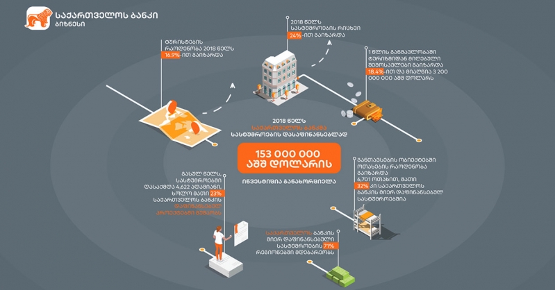 საქართველოს ბანკმა, ტურიზმის სექტორში მცირე და საშუალო ბიზნესის ხელშეწყობის მიზნით, 2018 წელს განხორციელებული პროექტები შეაჯამა. საქართველოს ბანკისთვის მნიშვნელოვანია ეკონომიკურად გამართული პროექტების დაფინანსება, ბიზნესის ხელშეწყობა, რადგან წარმატებული კერძო სექტორი, ქვეყნის ეკონომიკის განვითარების წინაპირობაა. 2018 წელს საქართველოს ბანკმა სასტუმროების დასაფინანსებლად ჯამში 153 მილიონი დოლარის ინვესტიცია განახორციელა. ბანკმა მცირე და საშუალო ბიზნესის რეგიონებში წახალისების მიზნით არაერთი პროექტი განახორციელა. სწორედ ამიტომ, საქართველოს ბანკის მიერ დაფინანსებული სასტუმროების 71% რეგიონებში მდებარეობს და ხელს უწყობს ადგილობრივი ეკონომიკისა და ტურიზმის განვითარებას. საქართველოს ბანკის მხარდაჭერით გასულ წელს, სასტუმროებში დასაქმდა 4,622 ადამიანი, აქედან 23% საქართველოს ბანკის მიერ დაფინანსებულ პროექტებში. 2018 წლის მანძილზე ოთახების რაოდენობა განთავსების ობიექტებში გაიზარდა 6,701 ოთახით, მათი 32% კი საქართველოს ბანკის მიერ დაფინანსებულ სასტუმროებს წარმოადგენს.