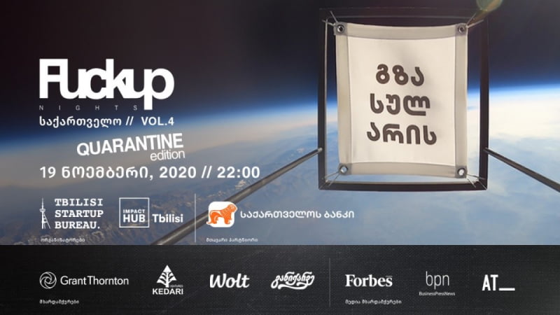 საქართველოს ბანკის მხარდაჭერით, 19 ნოემბერს Fuckup Nights საქართველო კარანტინში vol. 4 – “გზა სულ არის“ გაიმართება. Tbilisi Startup Bureau და Impact Hub Tbilisi ღონისძიებას უკვე ოცდამეექვსედ მასპინძლობენ. მიმდინარე მოვლენების გათვალისწინებით, Fuckup Nights კვლავ ონლაინ რეჟიმში ჩატარდება.