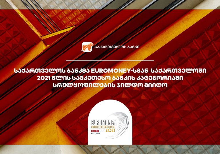 ავტორიტეტულმა ფინანსურმა ჟურნალმა, Euromoney-მ, საქართველოს ბანკი “Best Bank in Georgia 2021“-ის კატეგორიაში „Euromoney Award for Excellence” – ის გამარჯვებულად დაასახელა. გადაწყვეტილების მიღებისას, Euromoney-ს რედაქტორებმა, ექსპერტებმა და ანალიტიკოსებმა ისეთი კრიტერიუმები გაითვალისწინეს, როგორიცაა: ბანკის საბაზრო პოზიცია და წილი, მომსახურების ხარისხი, ახალი პროდუქტები, ინოვაციები და სხვ.