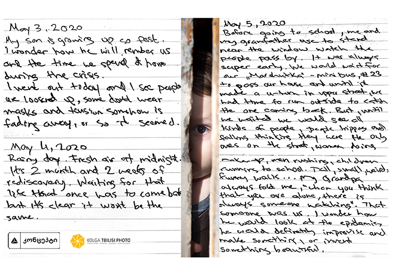 როცა ლოქდაუნი დაიწყო და ყველაფერი შეწყდა, მათ შორის ჩემი სამსახურიც, საკუთარ თავს მივეცი დავალება, რომ ყოველდღე გადამეღო ფოტოები და მეწერა, რითაც არაცნობიერად საკუთარ თავს შფოთვასთან გამკლავებაში ვეხმარებოდი. სამი თვის განმავლობაში, ყოველდღე თითო ფოტოს ვიღებდი და საკუთარ ნააზრევს ვიწერდი. ჩემს ვებსაიტზე უწყვეტი ჰორიზონტალური გვერდი შევქმენი, სადაც ყოველდღე თითო ფოტოს და დასკანირებულ ხელნაწერ ტექსტს ვტვირთავდი. დღიურის გაფიზიკურებით, მინდოდა, რომ ის წიგნზე მეტი ყოფილიყო. წიგნი აკორდეონის ნაკეცებადაა აკინძული 11 მეტრის სიგრძეზე, როგორც უწყვეტი პანდემიის გაუთავებელი დღეები. გვერდები ისევე დეფორმირდებოდა, როგორც დღეები კარანტინის დროს. წიგნის შუაგულში ჩემი შვილის ფოტოა, რომელიც კარის ღრიჭოდან იყურება. როგორც ბევრნი საკუთარი სახლიდან ახალ სამყაროს ვუყურებთ და ვცდილობთ, ბუნდოვან ვითარებაში გავრკვეულიყავით. ჩემი შვილის გამოსახულების უკან ხის კუბიკებია. ლოკდაუნის დროს ის ყველა სათამაშოთი თამაშობდა, რომელიც სახლში ჰქონდა, ხის კუბიკების გარდა. კუბიკები წიგნში ჩავრთე, როგორც ნივთი, რომელიც უარყვეს — ისევე, როგორც მე უარვყოფდი ახალ სამყაროს.