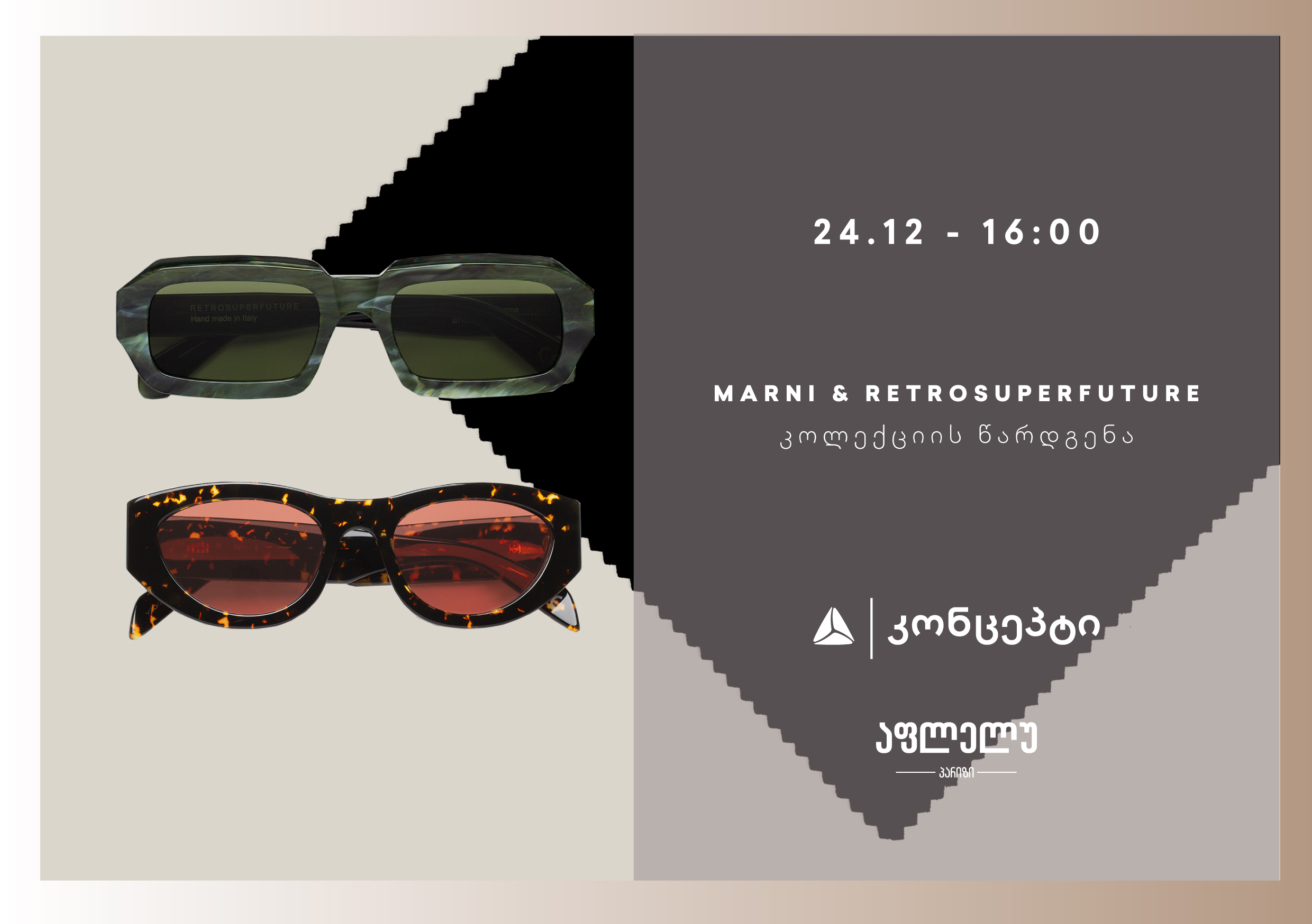 24 დეკემბერს, 16:00 საათზე, თიბისი კონცეპტის და „აფლელუ პარიზის“ თანამშრომლობის ფარგლებში, მარჯანიშვილის 7-ში მდებარე მულტიფუნქციური სივრცე, იტალიური ბრენდების Marni-ის და Retrosuperfuture-ის ხელნაკეთი სათვალეების ექსკლუზიური კოლექციის წარდგენას უმასპინძლებს.