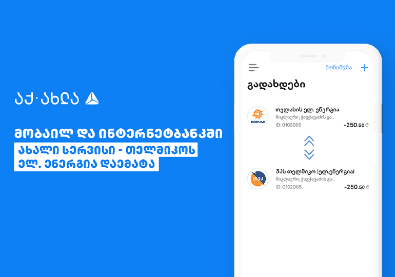 იმისათვის რომ გავუმარტივოთ მომხმარებლებს ეს ცვლილება, თიბისის ინტერნეტ და მობაილბანკის სისტემაში ახალი სერვისი დაემატა – თელმიკოს ელ. ენერგია. მათ ამ ახალ სერვისზე ელექტროენერგიის გადახდის შაბლონები, იგივე აბონენტის ნომრით ავტომატურად გამოუჩნდებათ მობაილ და ინტერნეტბანკის კომუნალური გადახდებში.